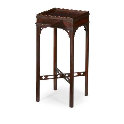 the square top with a wavy gallery, above a plain frieze with a cup slide, raised on moulded straight legs joined by pierced X stretchers