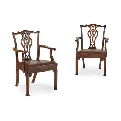 comprising ten side chairs and a pair of armchairs, the serpentine crest rails above pierced and carved interlaced vasiform splats, over wide stuffover seats covered in brown leather with close nail trim, raised on channel moulded square straight legs with foliate carved corner blocks and ending in Marlborough feet; stamped with serial numbers to the seat rails (12)