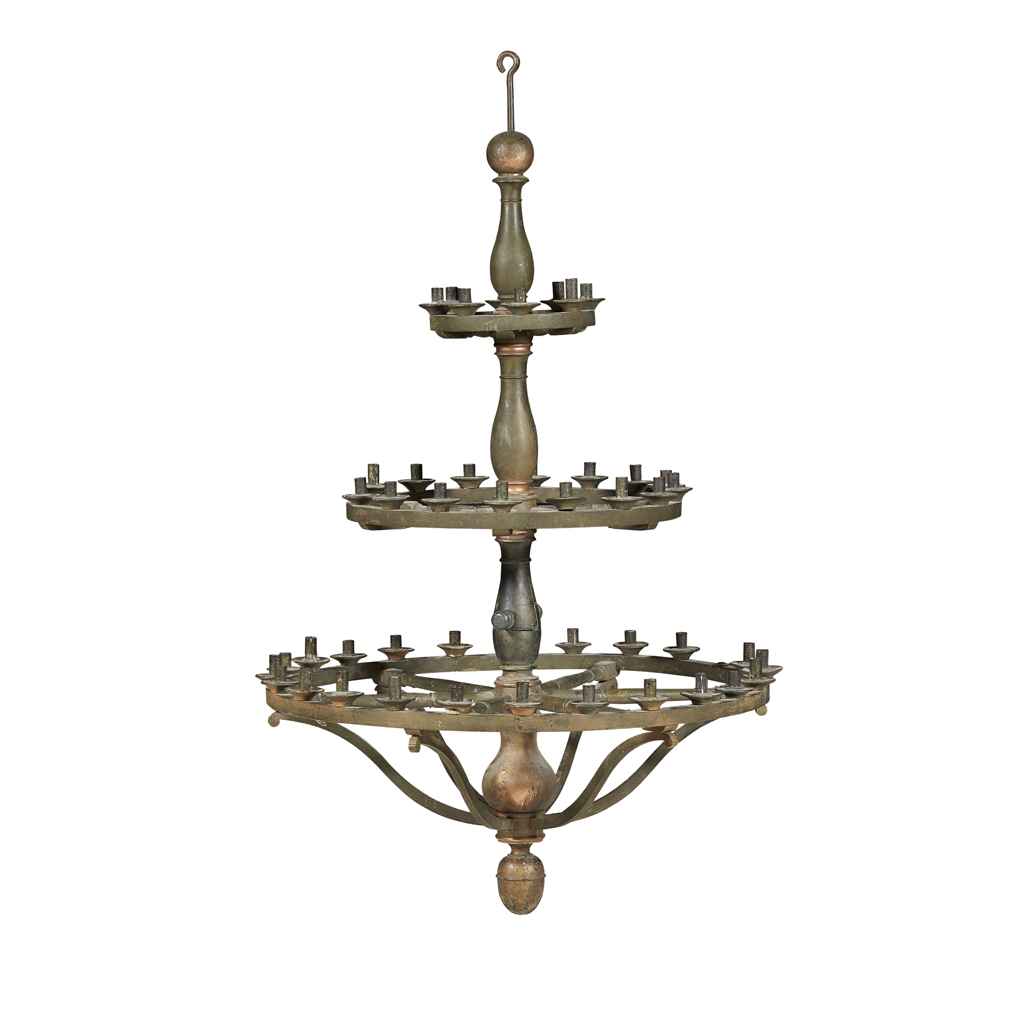 the turned baluster central column with three graduated tiers mounted with turned candle holders, painted green, with a turned knop pendant finial and arched supports
