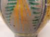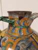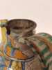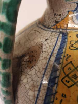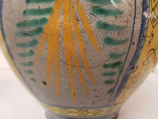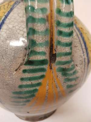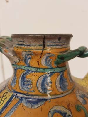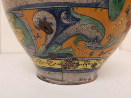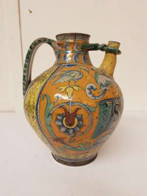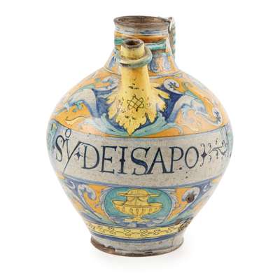 with short cylindrical neck and tubular spout united by a single twisted rope of clay, fitted with a thick handle of flat joined bands decorated with green stripes, above the bulbous body with pharmacy label inscribed SYo. DEISAP. O and a gadrooned urn, decorated throughout with polychrome grotesque decoration of stylised dolphins, birds and flowerheads on an orange ground, within characteristic bands of interlaced ornamental knotwork, incised L6 d ?2 to the base, (for ‘libbre’ (pounds) and ‘once’ (ounces) likely equating to 2095.2gm, its modern weight when empty)