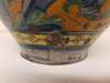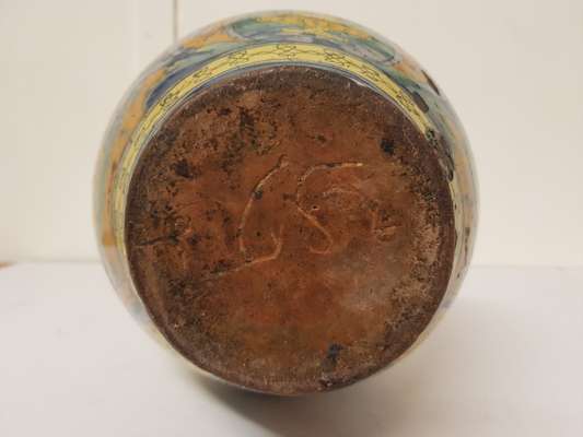 Note: This jar belongs to a small group of recorded surviving jars from Siena with characteristic shapes and handles made circa 1500-circa 1530 for various pharmacies. All known survivors were made and labelled to contain syrups. Two (one in the V&A and one in the Museo Internazionale delle Ceramiche Faenza) are decorated on a dark blue ground and one, very similar to this example, (in a private collection) on a dark orange ground (see Mario Luccarelli and Anna Migliori Luccarelli, ‘L’evoluzione della maiolica senese dall’immaginario medievale al ‘capriccio’della grottesca’, in La ceramica a Siena dalle origini all’Ottocento, ed. Margherita Anselmi Zondadari and Paolo Torriti,2012, figs 90-91, p68-69.). This orange ground was popular with early 16th century Sienese maiolica potters. The group relates in decoration and colour to tiles made in Siena in particular to those made for the Santa Caterina Oratory of 1504-5. This drug jar here also relates to a group of smaller dark orange grounded albarellos made from 1500 and in particular to one dated 1515 in the Metropolitan Museum of Art New York (see Timothy Wilson, Maiolica - Italian Renaissance Ceramics in the Metropolitan Museum of Art, 2016, cat22, p96-7.).