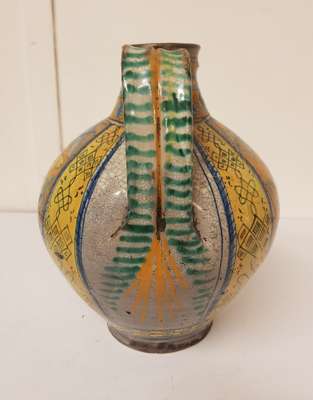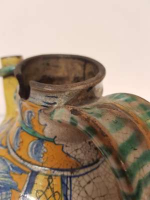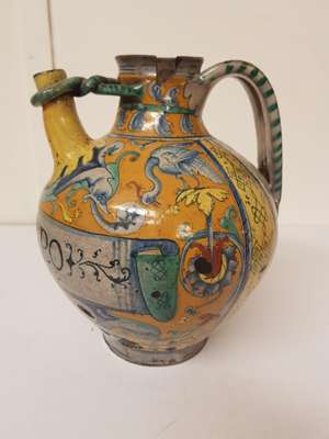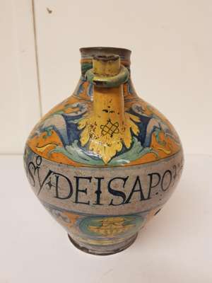 UNRECORDED ITALIAN MAIOLICA HANDLED SPOUTED DRUG JAR