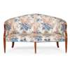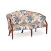 in the Hepplewhite style, the curved and arched back above a padded seat, raised on square tapering legs with boxwood line inlay and ending in brass caps; in blue and mauve striped foliate upholstery