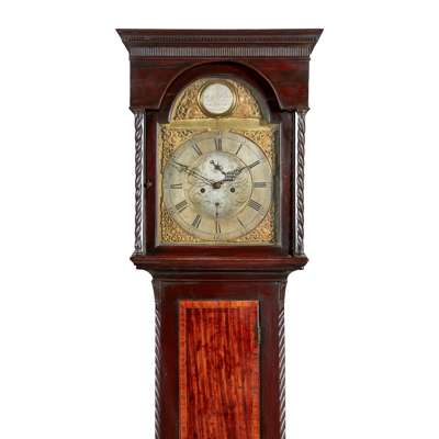 the dentil moulded and fluted cornice above an arched brass and silvered dial with subsidiary date and seconds dials, signed boss to the arch 'James Stewart/ GLASGOW', flanked by spiral columns, above a banded trunk door flanked by spiral quarter columns, on a plinth base with bracket feet, the eight-day twin train movement striking a bell