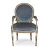 the curved oval back above a wide seat and open part-padded arms, raised on stop-fluted tapered legs, the frame painted in pale blue over grey with gilt highlights and blue plush upholstery