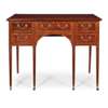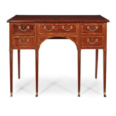 the banded top above a central drawer and arched recess, flanked by two short drawers to one side and a deep drawer on the other, raised on square tapered legs ending in brass caps and castors