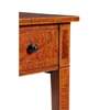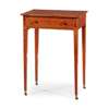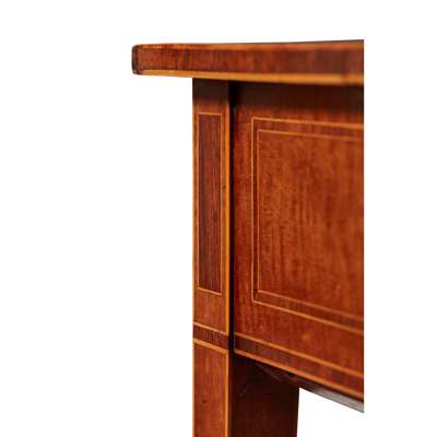 the crossbanded top outlined with stringing above a frieze drawer with ebonised turned knobs and fitted with a lift-out tray, with a dummy drawer opposing, raised on slender square tapered legs ending in brass caps and castors