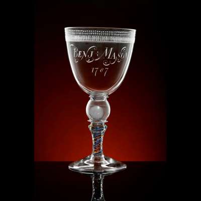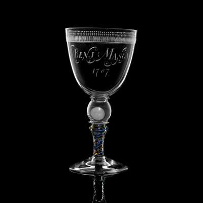 the large rounded bowl engraved with BENJ MASON/ 1787 above a blown knop containing a silver shilling for 1787, above a tri-coloured opaque twist stem of yellow, blue and white enamel, and a conical foot