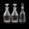 with domed star-cut stoppers above ring-cut sloped necks and cylindrical bases, 27cm high; together with an ENGRAVED GLASS WINE DECANTER AND STOPPER, with flattened facet-cut stopper and shouldered body, the engraving imitating a label inscribed W. WINE, 28cm high