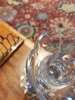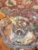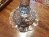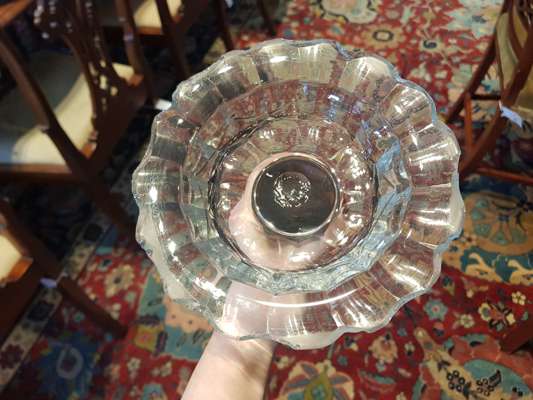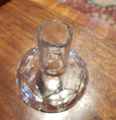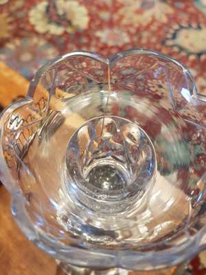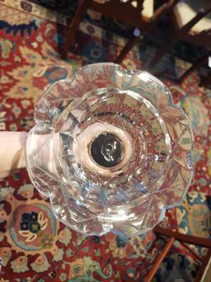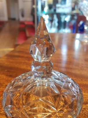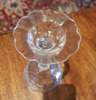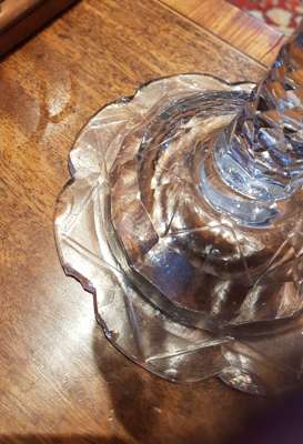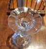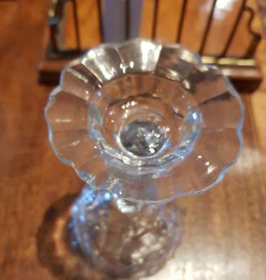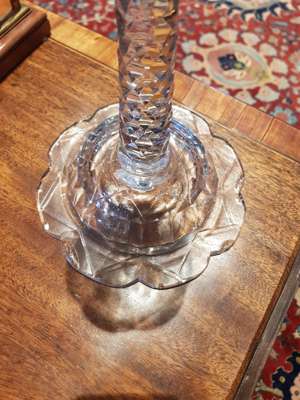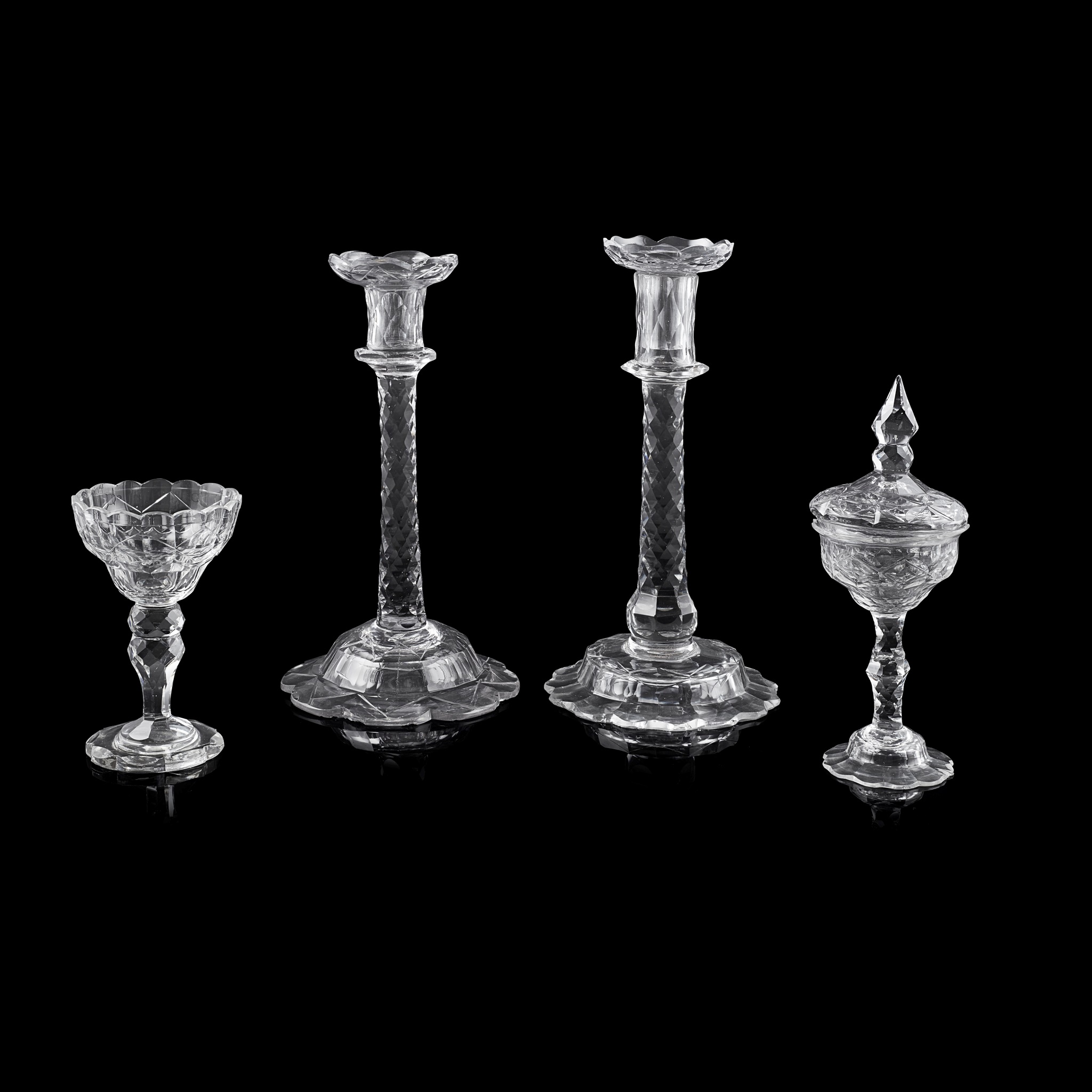 comprising two facet-cut candlesticks, with lobed rims and cylindrical nozzles above cut stems and domed feet, 31.5cm and 30.5cm high; together with two sweetmeat glasses, one with a matched cover, with ogee shaped bowls on knopped stems and lobed feet, 25cm and 16cm high