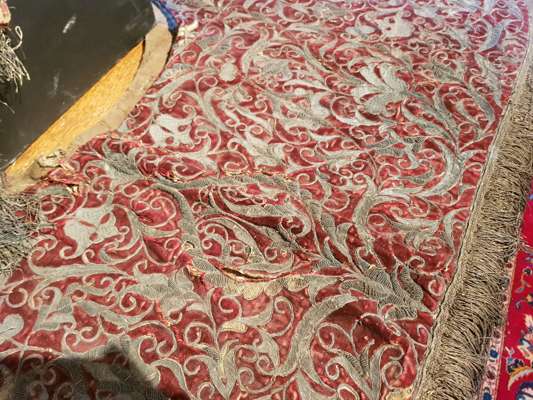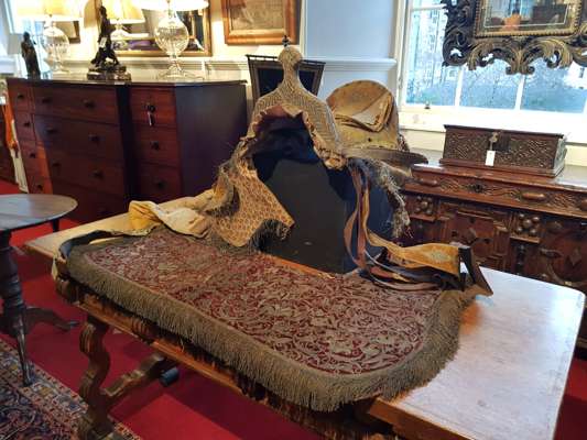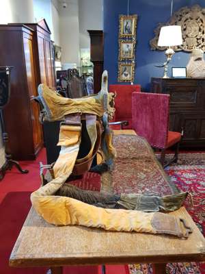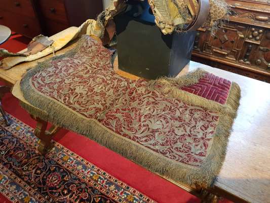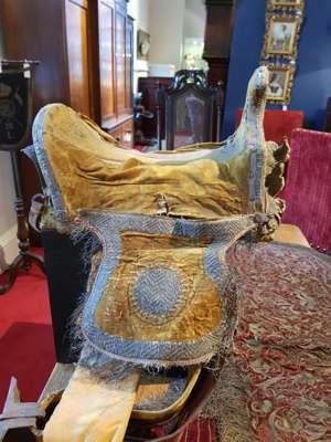 the saddle with a raised pommel and cantle, covered in yellow velvet with metallic thread embroidery; the saddle cloth of red silk velvet with floral and foliate metallic thread embroidery and gilt metallic thread tassel trim