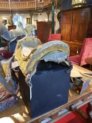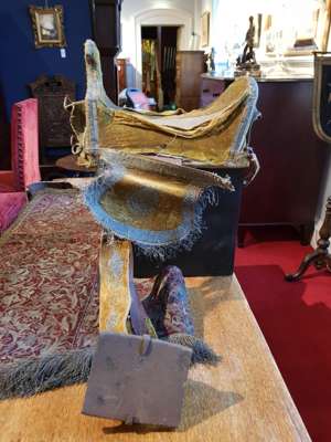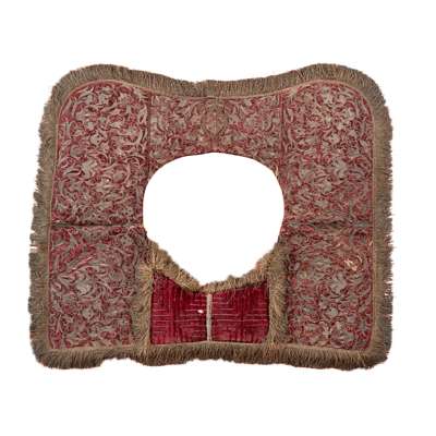 OTTOMAN SADDLE AND METAL-THREAD EMBROIDERED RED GROUND SADDLE CLOTH