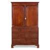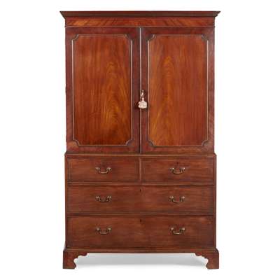 the dentil moulded cornice above a pair of moulded panel doors opening to hanging space; the lower part with two short and two long drawers, raised on shaped bracket feet