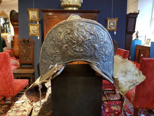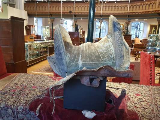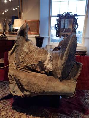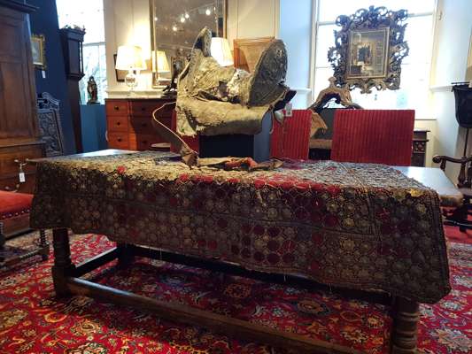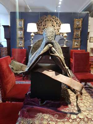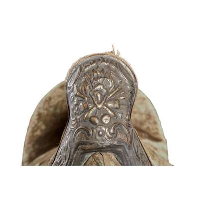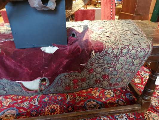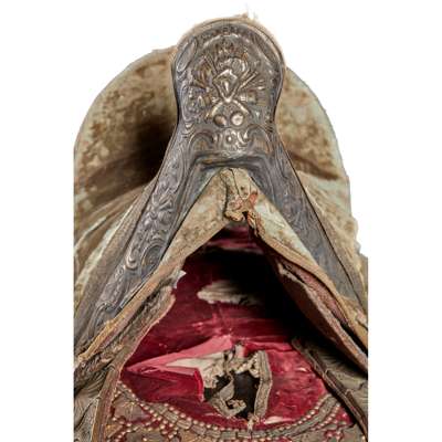 the saddle covered in yellow silk velvet with a white metal horn embossed with a cartouche and military trophy; the trapezoidal saddle-cloth of red silk velvet with applied gilt metal stars and silvered stud decoration, the central reserve with cut-outs for the the saddle back and horn; with a partial leather and white metal bridle and breastplate