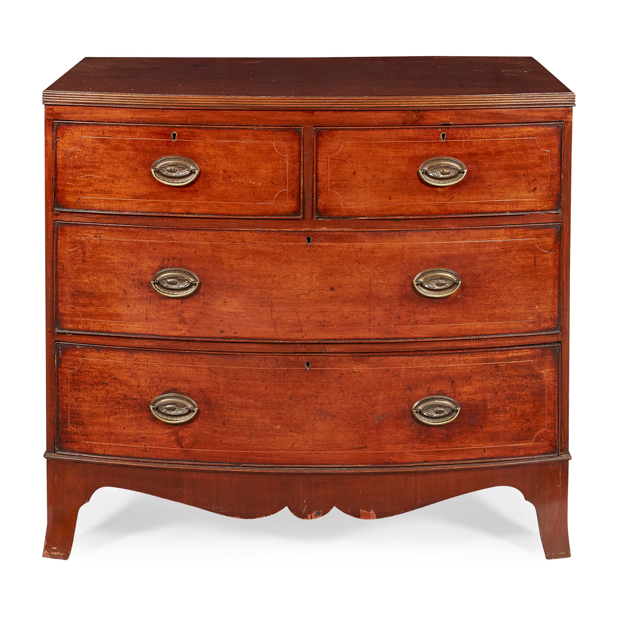 the top with a moulded edge and line inlay above two short and two long drawers, with a shaped apron and French bracket feet