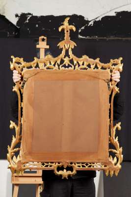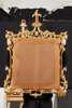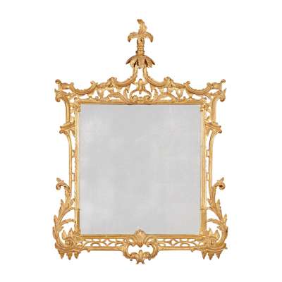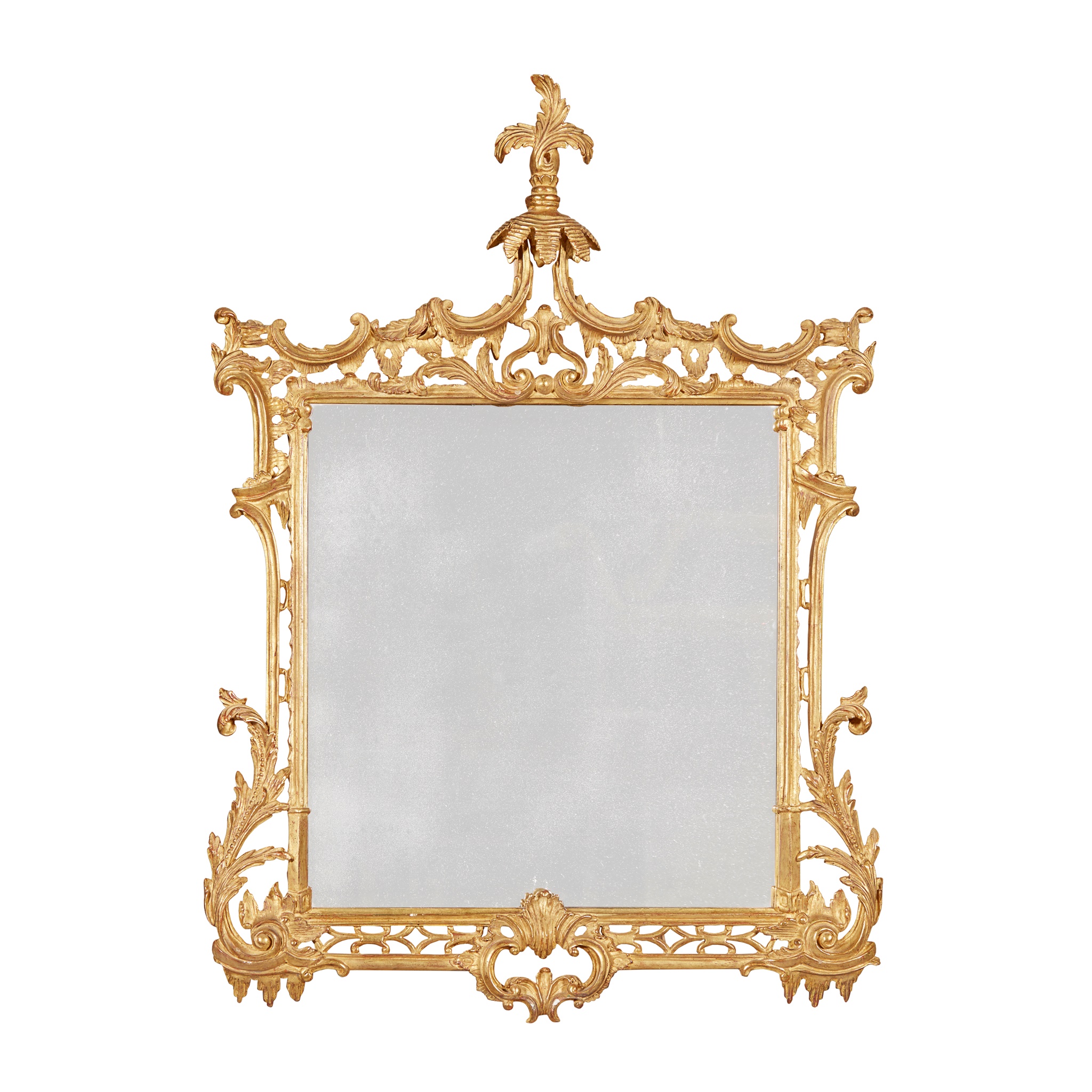 the squared mirror plate in a pierced leaf and rocaille carved frame with a foliate finial