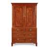 the moulded cornice above a pair of moulded and crossbanded doors centred by oval panels, enclosing hanging space; the lower part with two short and two long drawers, raised on shaped feet
