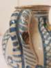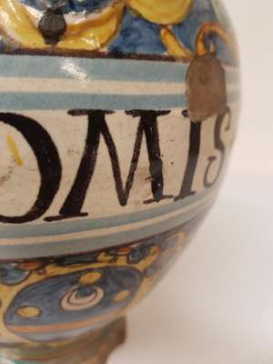 with a short cylindrical neck and spout with a moulded mask, united by a single twisted rope of clay, with a rounded handle consisting of two adjoined bands within bands of blue crosses and scrolls, above the ovoid body with an inscribed label SYo. DI. POMIS. S., and decorated with an unidentified shield of arms and the initials F and L, amongst grotesques, putti, beasts and fruit on a dark blue ground