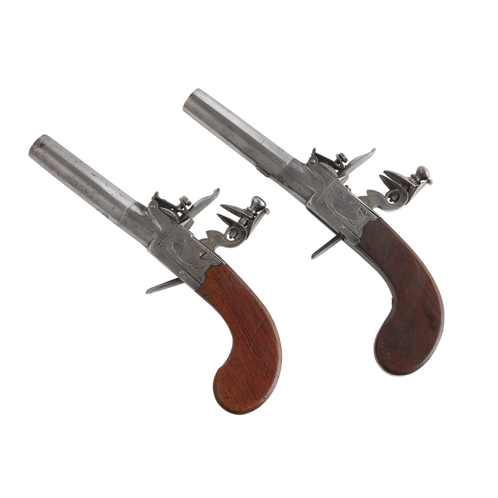 PAIR OF FLINTLOCK BOX-LOCK TURN OFF PLAIN CANNON BARREL POCKET PISTOLS