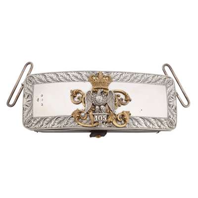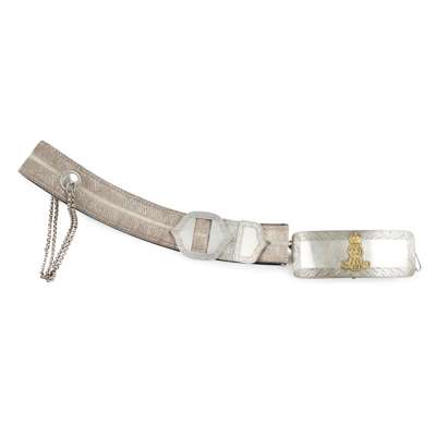 comprising an officer's silver and ormolu mounted flap pouch to the 1st Royal Dragoons, with centre badge of the French eagle captured at the Battle of Waterloo within engraved leafy border, hallmarked Birmingham 1899; and an officer's Sheffield silver plated flap pouch and belt, to the Glamorganshire Imperial Yeomanry, circa 1901