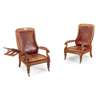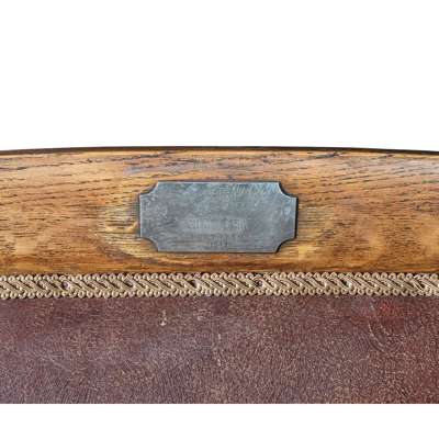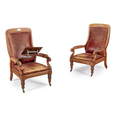 each with high padded back and seat in red leather flanked by part padded arms ending in scrolled hand holds, raised on lappet carved legs with brass caps and castors, one chair fitted with a brass and oak adjustable bookrest and bearing a white metal plaque inscribed 'HMS Brittania/the wooden home of/Will. F. Blair/for 7 years/1842', the other chair lacking bookrest, bearing similar plaque engraved 'The Royal George/Sunk at Spithead Aug 19th 1782/1100 souls perished/Recovered 1840'