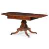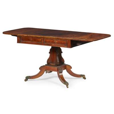 the rounded rectangular top with a bead moulded edge and drop ends, above a pair of short frieze drawers with dummy drawers opposing, on a tapered square column with further bead moulding and scroll brackets, raised on acanthus carved and hipped sabre legs ending in foliate brass caps and castors