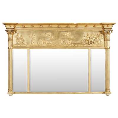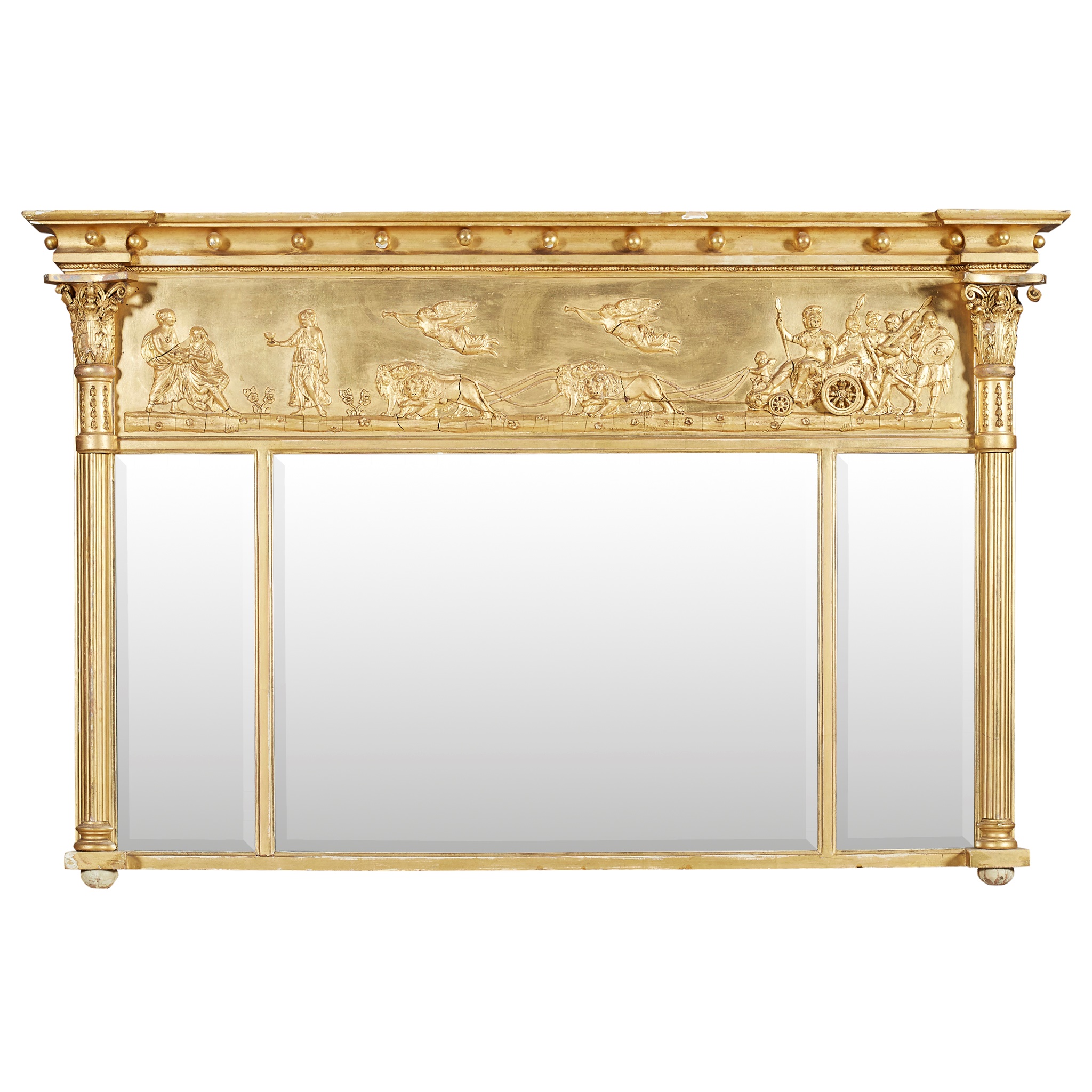 the inverted breakfront cornice with ball mounts above a frieze depicting Apollo and chariot pulled by lions, above a triple mirror plate flanked by reeded columns