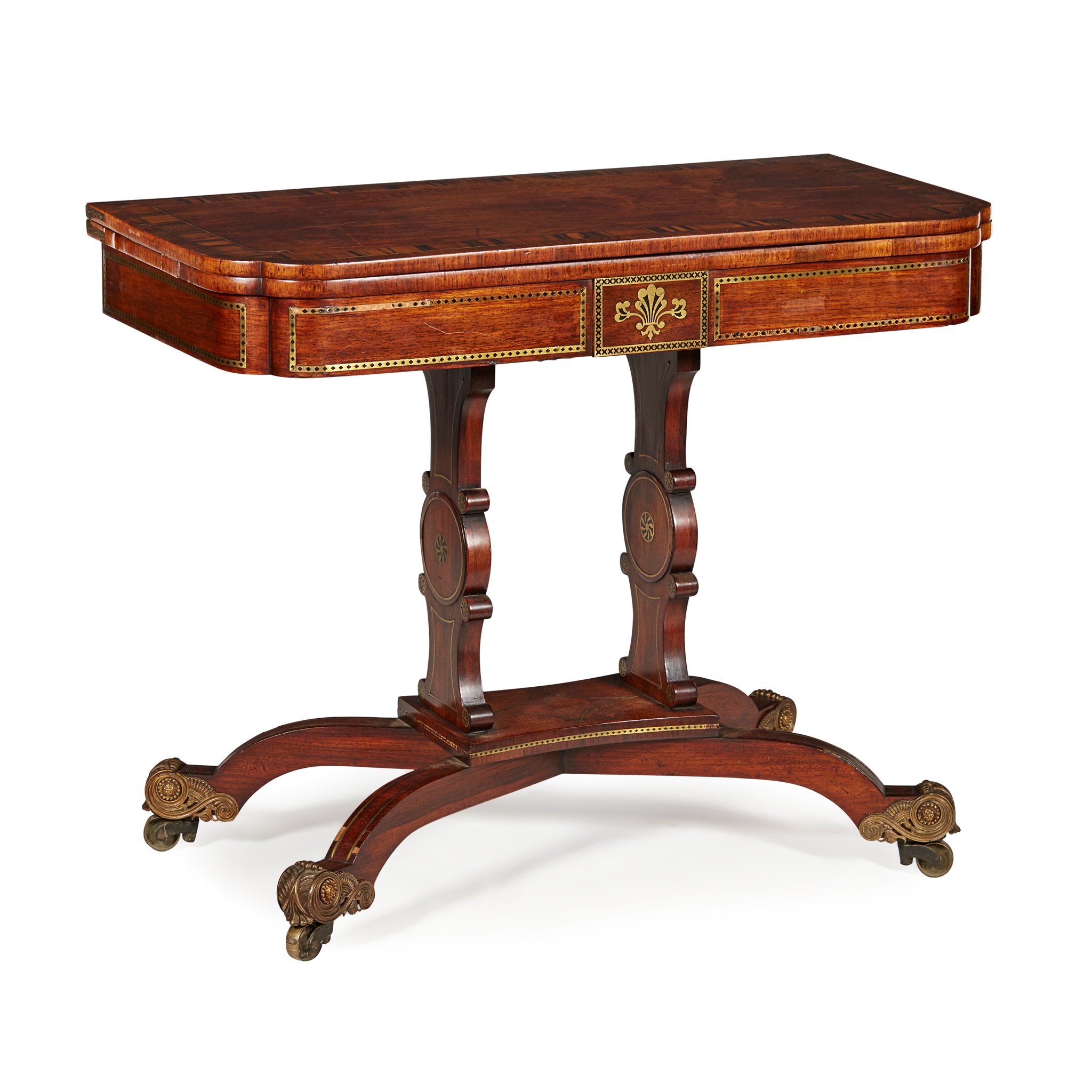 the rectangular crossbanded fold-over top with notched corners, opening to a green baize-lined playing surface, above tablet frieze inlaid with anthemion and pierced brass banding, on waisted supports and arched legs ending in leaf cast brass caps and castors