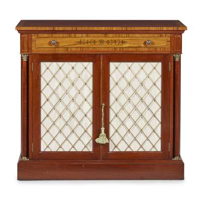 the crossbanded top above a long frieze drawer and a pair of cupboard doors with brass grille inserts lined with cream silk and flanked by columns, on a plinth base