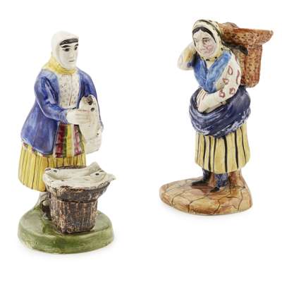 both in traditional costume, the first carrying a basket of fish on her back, on a 'paved stone' base, 20.5cm high; the second holding a fish, with a basket of fish at her feet, on a green painted base, 21cm high