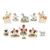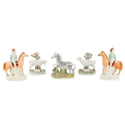 comprising a cow spill vase, 25.5cm high; a pair of horses and jockeys, 23cm high; two cows with a milkman and milkmaid, 22cm high; a zebra, 20cm high; St George fighting the dragon, 19cm high; a pair of cow spill vases, 18cm high; a cow creamer, 12.5cm high; and a small dog, 6.5cm high