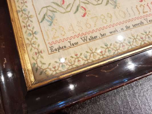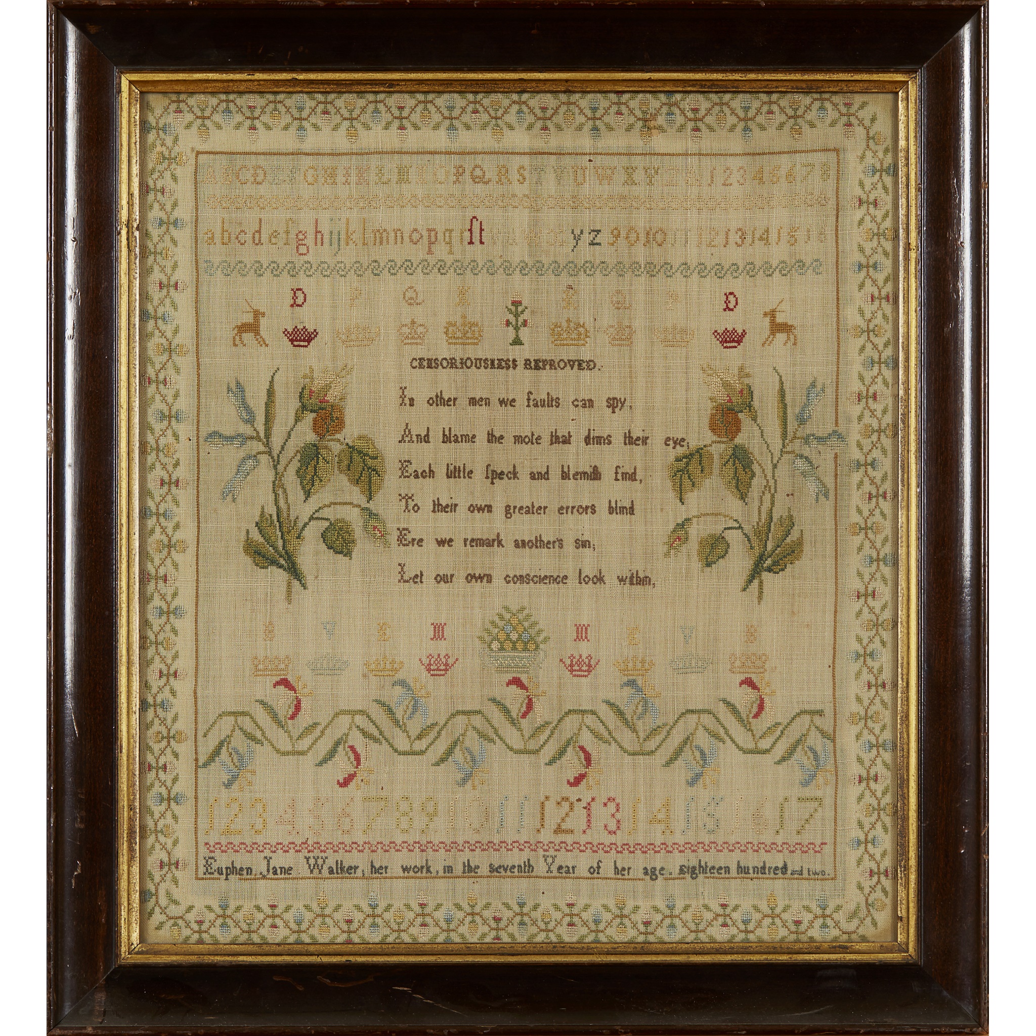 of rectangular form, depicting alphabets and a verse above floral sprays, coronets, stags, and a flower border, with number series and inscription EUPHEN JANE WALKER: HER WORK, IN THE SEVENTH YEAR OF HER AGE. EIGHTEEN HUNDRED AND TWO, glazed and framed