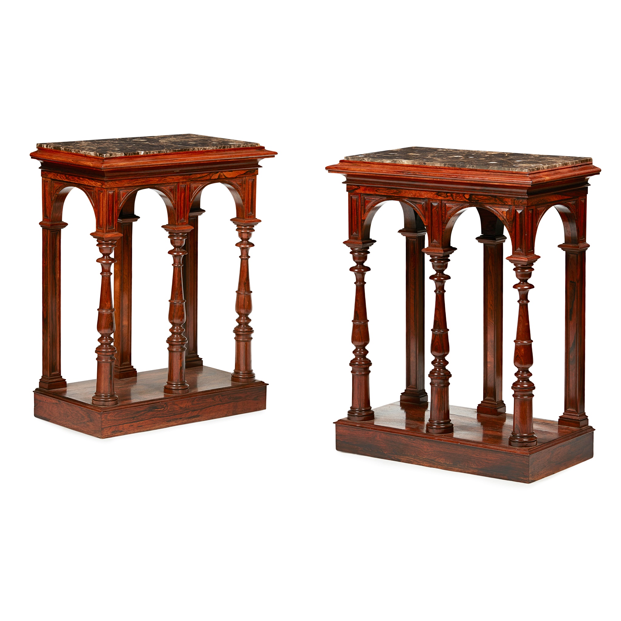 of small size, the later rectangular inset marble tops set above moulded arched friezes, raised on slender turned baluster supports and plinth bases