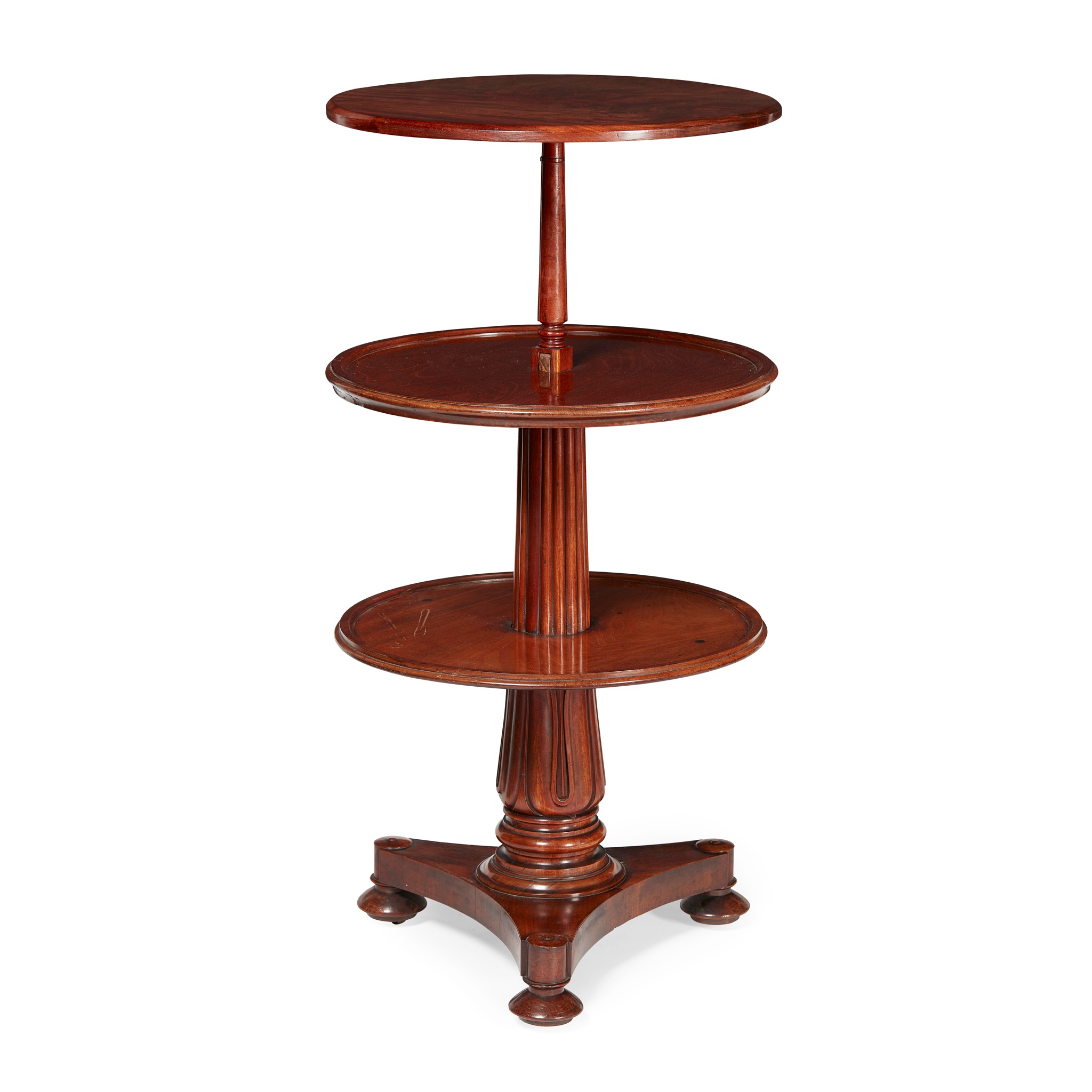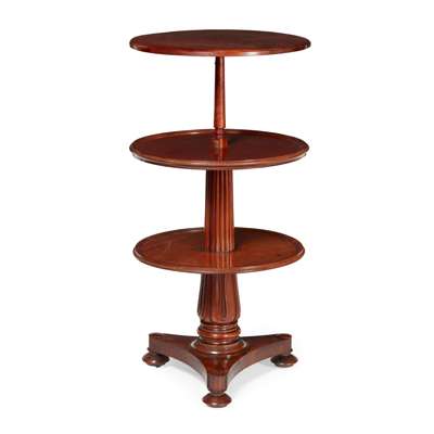with three dished circular tiers, the top tier extending, supported on reeded and leaf-carved column and triform base with disc feet with recessed castors