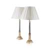 with gilt collars above slender hexagonal tapered columns, on Gothic tracery bases, fitted for electricity, with white pleated shades