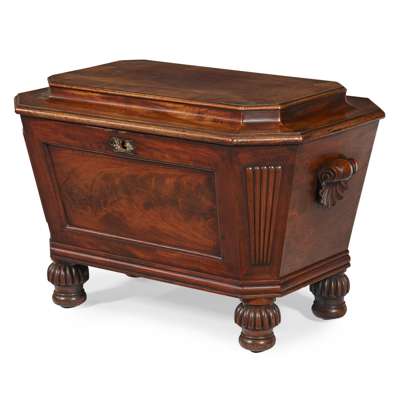 of sarcophagus form with canted, reeded angles and shell and scroll carved handles to each side, raised on turned lobed feet