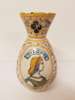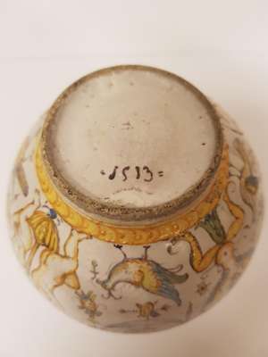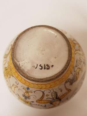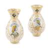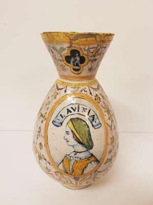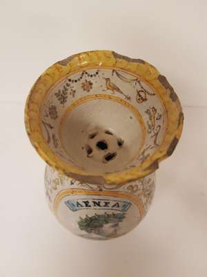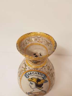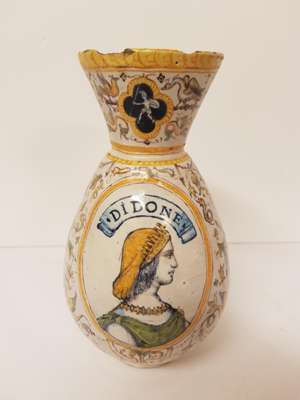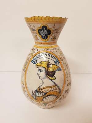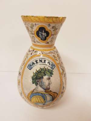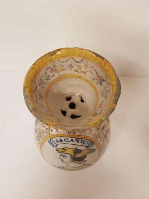 with everted necks and pierced interior platforms, above rounded pear-form bodies, raised on short feet, decorated with labelled reserves depicting the figures 'AENEA', 'ASCANIO', ’LAVINIA’ and ‘DIDONE’ all on grotesque decorated white grounds with yellow borders