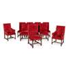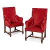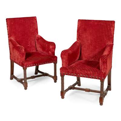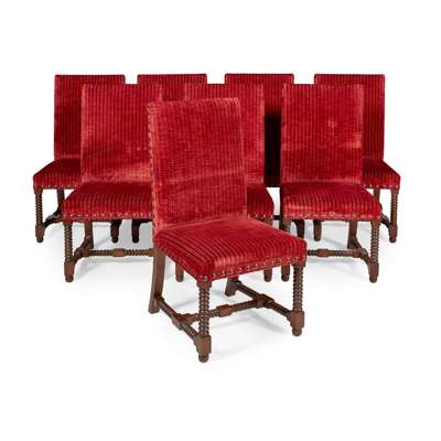 comprising a pair of armchairs and eight side chairs, the rectangular padded backs and square seats covered in red plush upholstery with close-nail trim, raised on ring-turned legs joined by stretchers, the armchairs with enclosed arms
