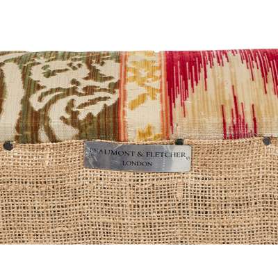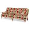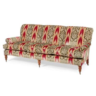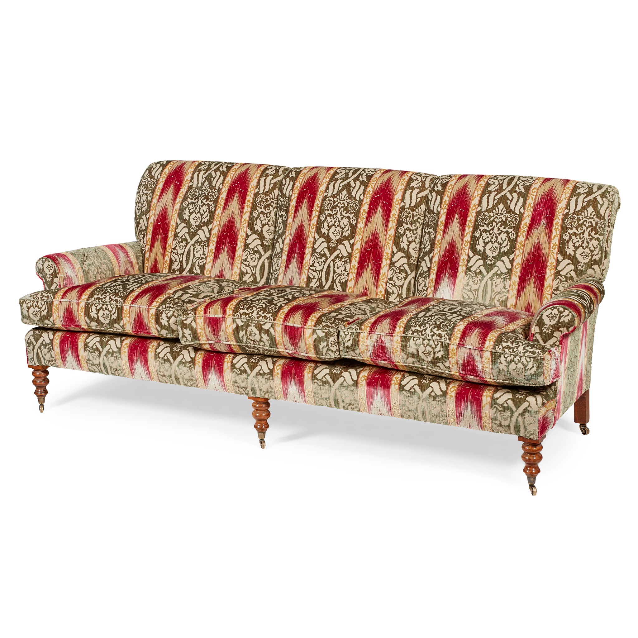 the triple tight upholstered back above three loose cushions flanked by low scroll arms, raised on turned mahogany legs with brass caps and castors, covered in Ikat style silk flame stitch and chenille upholstery