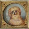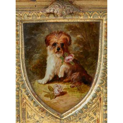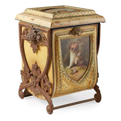 the recessed top with a glazed square painted panel of a dog, above the hinged fall-front bucket with a corresponding painted panel, on pierced iron X form brackets united by spiral stretchers