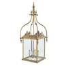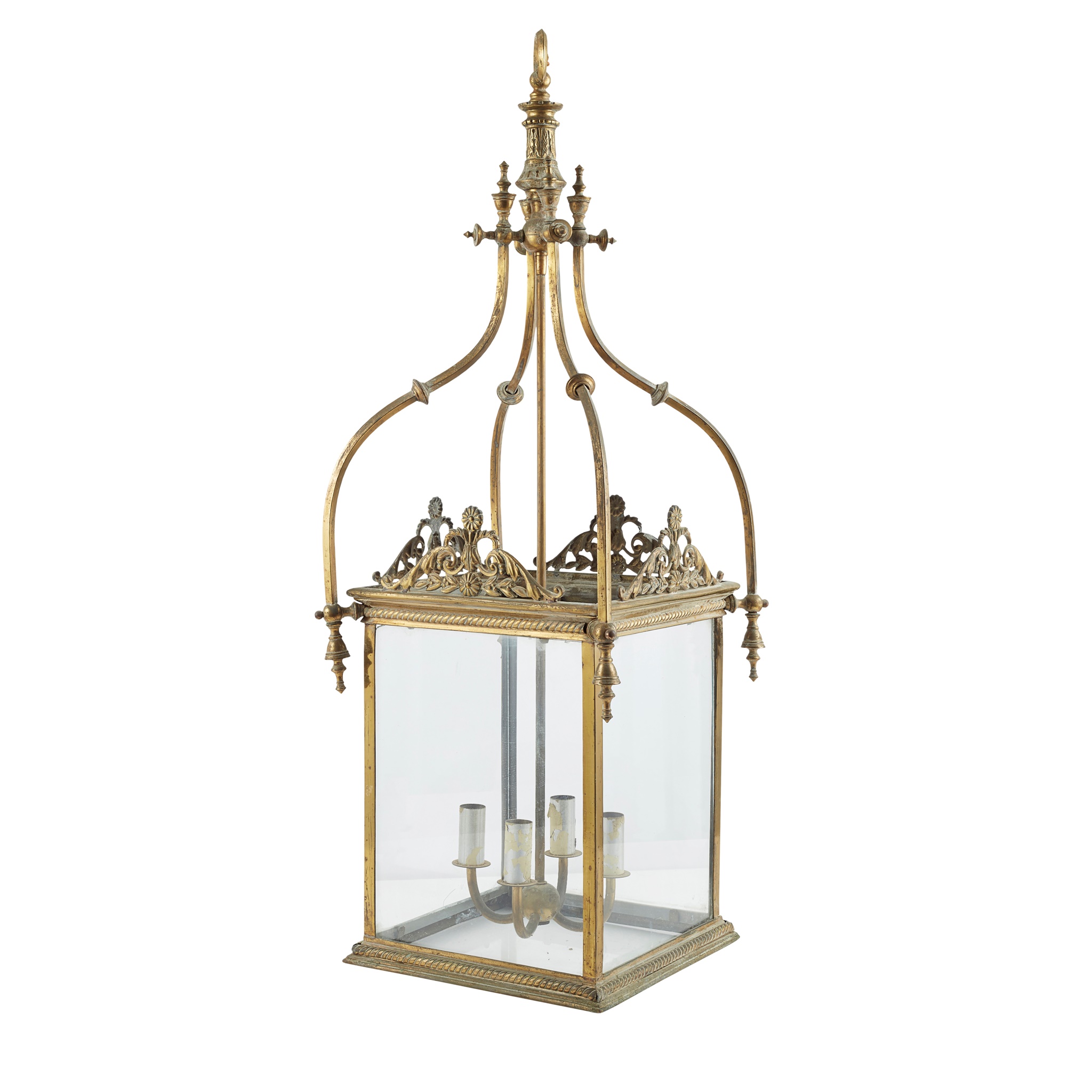 of squared form, the glass panes surmounted by pierced foliate mounts and united by curved uprights issuing a single pole fitted with four light sconces, fitted for electricity