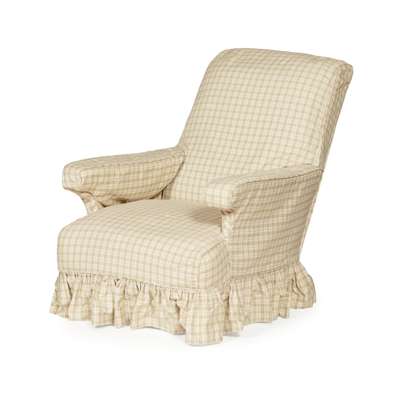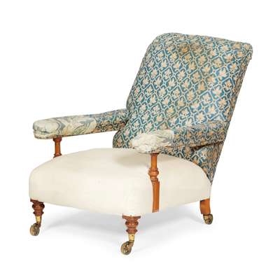 the angled padded back above a deep stuff-over seat and padded open arms, raised on turned legs with brass caps and spoked castors, the castors stamped COPE, partially covered in blue printed fabric and a later cream slipcover