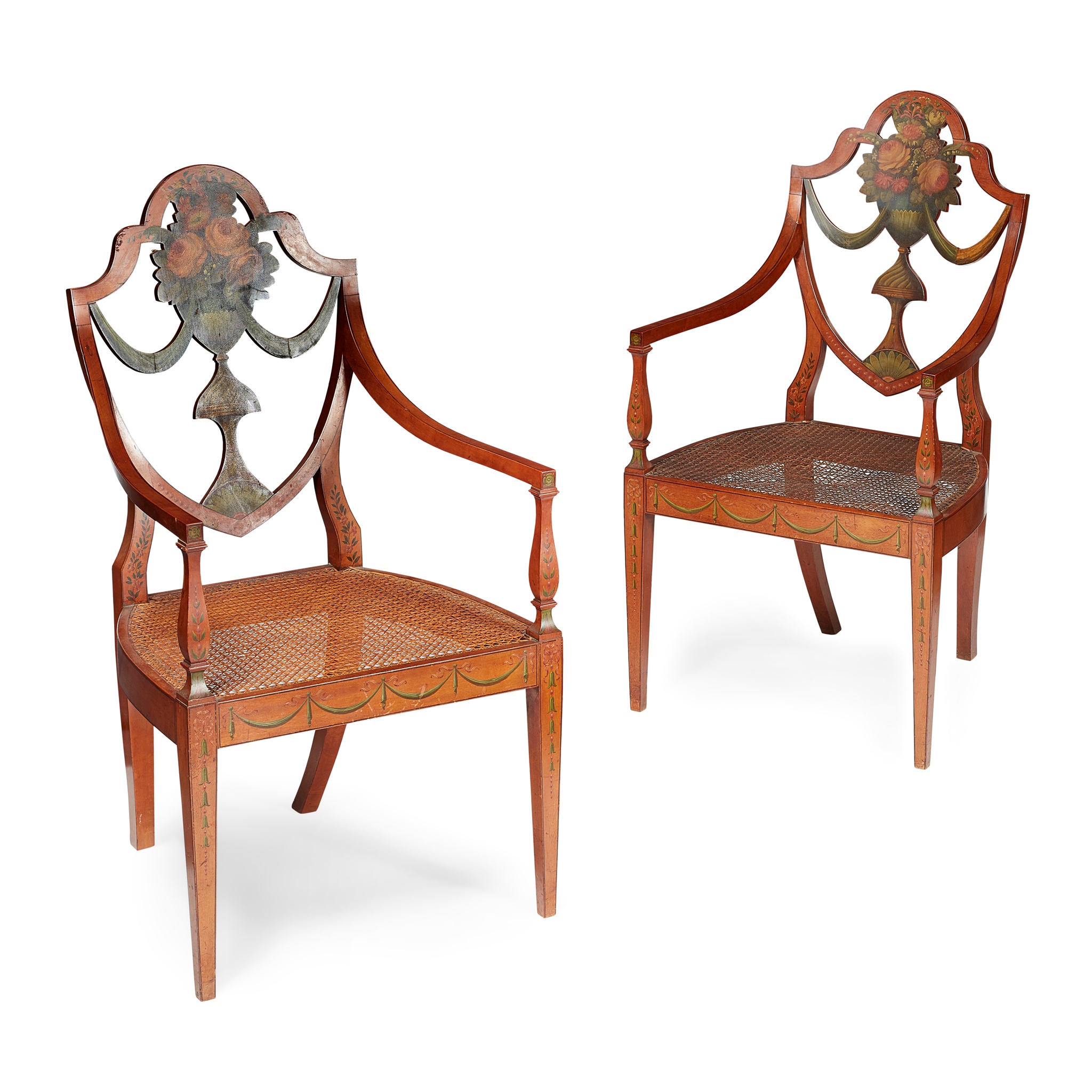 the shield-shaped backs painted with flower-filled urns above caned seats and swag painted seat rails, raised on square tapered legs