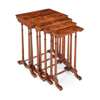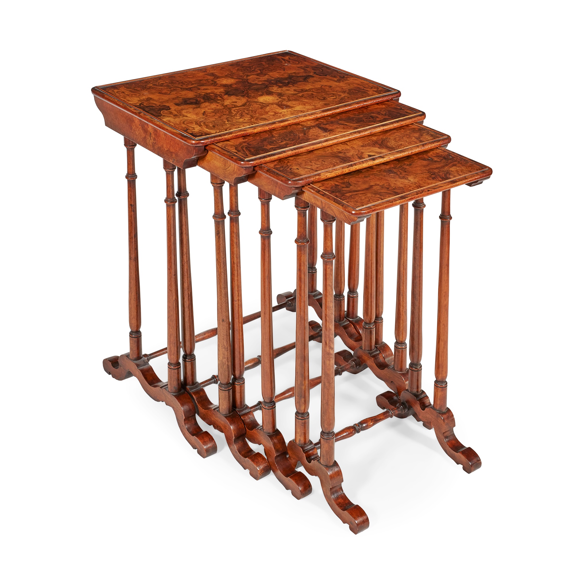 the quarter-veneered tops with moulded edges raised on tapered and ring turned supports on arched trestle bases joined by turned stretchers
