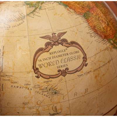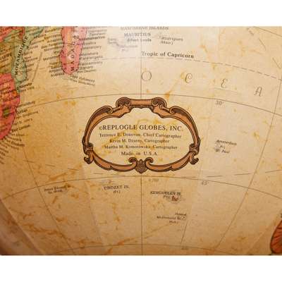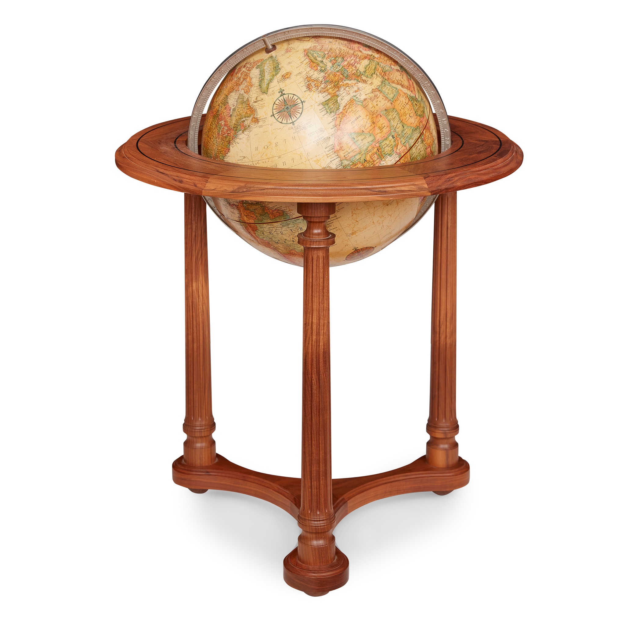 with a Replogle globe set within an ebony line inlaid horizon ring raised on turned and tapered columns linked by stretchers, bearing maker's label LINLEY, LONDON