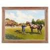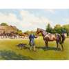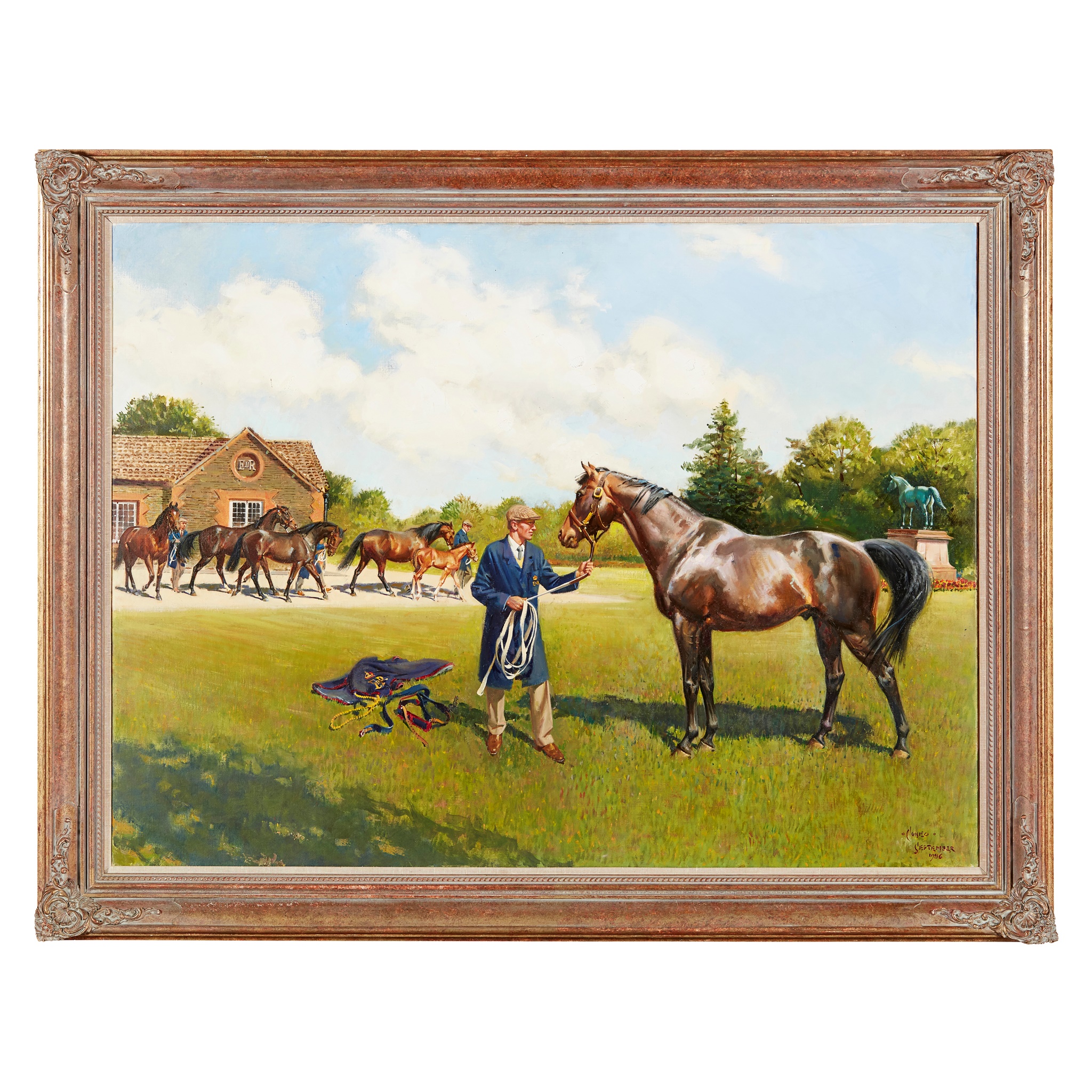 Note: This work was painted to commemorate the centenary of thoroughbred breeding at the Royal Stud, Sandringham, 1887-1997. The leading European Classic Sire, Shirley Heights, surveys a part of his 1986 Court- (left to right) the Champions, Dunfermline, Akiyda and Pawneese, led by Seattle Slew's half-sister, Clandestina with her filly foal by Nijjinsky JJ.