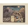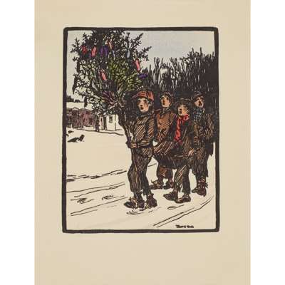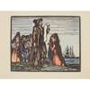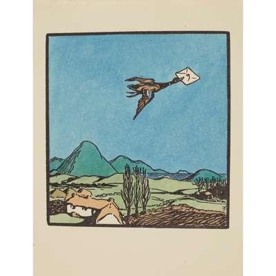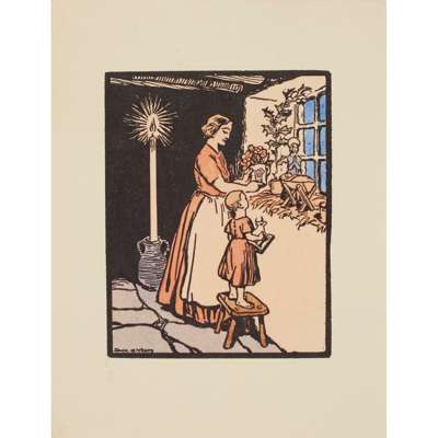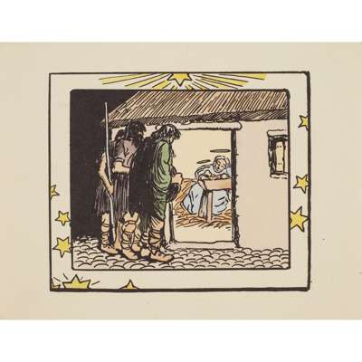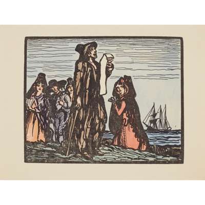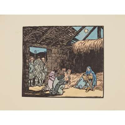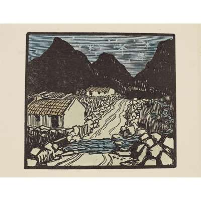 Hand-coloured Cuala Press print, unframed and seven other similar prints by the same hand, 'The star in the East', 'Mountain road', 'The crib', 'The message', 'Day closes', 'The star is risen' and 'Once I went o'