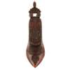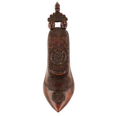 the arched handle carved with three masks, with an oblong cover depicting a flowerhead amongst diamonds and radiating lines, above a 'buckle' and further flowerhead to the pointed tip