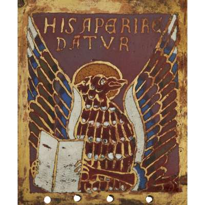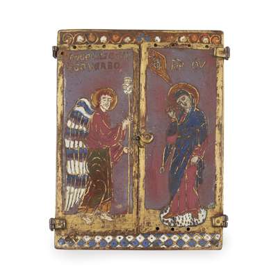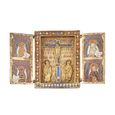 the hinged covers depicting the Archangel Gabriel and Mary, opening to an applied scene of the Crucifixion with Mary and St. John, flanked by panels with the four Evangelists, inscribed in Latin on the bottom edge 'MAGISTER VINVANTH ... IONIS AURIF EX PAIAURIRI ME FECIT MCC[]XXXV