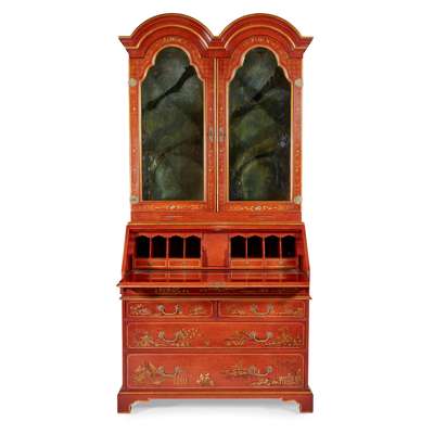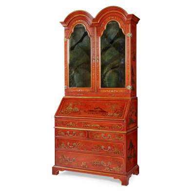 GEORGE I STYLE RED JAPANNED BUREAU BOOKCASE